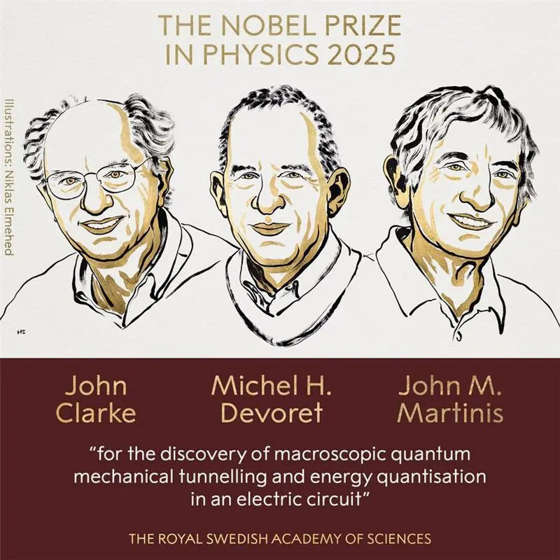 北京时间 10 月 7 日 17 时 45 分许,2025年诺贝尔物理学奖揭晓,该奖项授予 John Clarke,Michel H. Devoret 和 John M. Martinis,以表彰他们发现电路中的宏观量子力学隧穿效应和能量量子化。