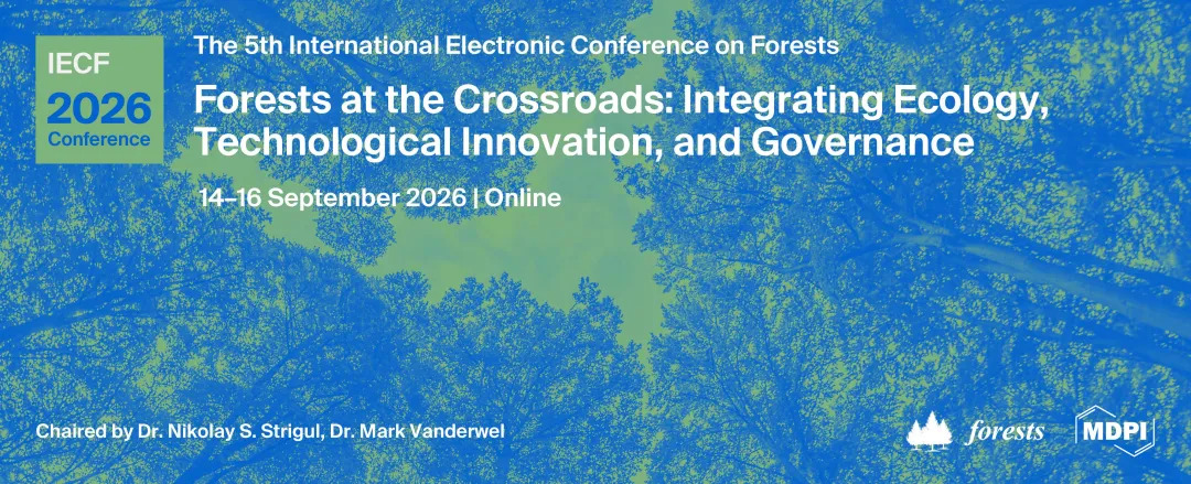由 MDPI Forests 期刊 (ISSN: 1999-4907;IF: 2.5) 主办的“第五届国际森林学科线上会议——十字路口的森林:整合生态、技术创新和治理 (The 5th International Electronic Conference on Forests–Forests at the Crossroads: Integrating Ecology, Technological Innovation, and Governance | IECF 2026)”将于2026年9月14日至16日在线举行。本届大会由美国华盛顿州立大学 Nikolay S. Strigul 博士与加拿大里贾纳大学 Mark Vanderwel 博士联合担任主席。