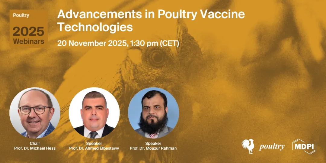 由 Poultry 主办的线上研讨会——家禽疫苗技术最新进展 (Poultry Webinar | Advancements in Poultry Vaccine Technologies),将于2025年11月20日20:30 (北京时间) 在sciforum.net网络平台召开。会议由期刊主编Prof. Dr. Michael Hess担任主席,并邀期刊编委Prof. Dr. Ahmed R. Elbestawy和Prof. Dr. Moaz Rahman Rahman共同带来主题演讲。