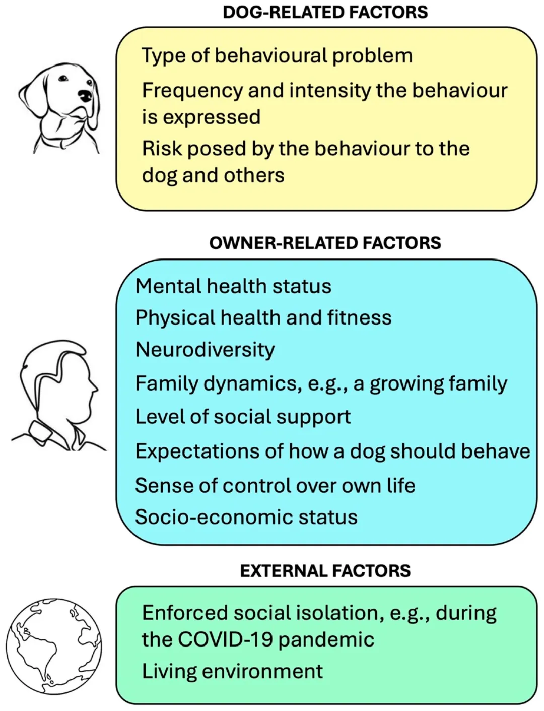 (1) 本文通过回顾21篇有关犬只行为问题与主人福祉之间联系的文献研究,总结出犬类的行为问题对主人的幸福感、情绪健康和社会功能等具有广泛的负面影响。