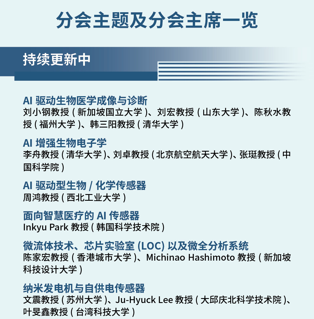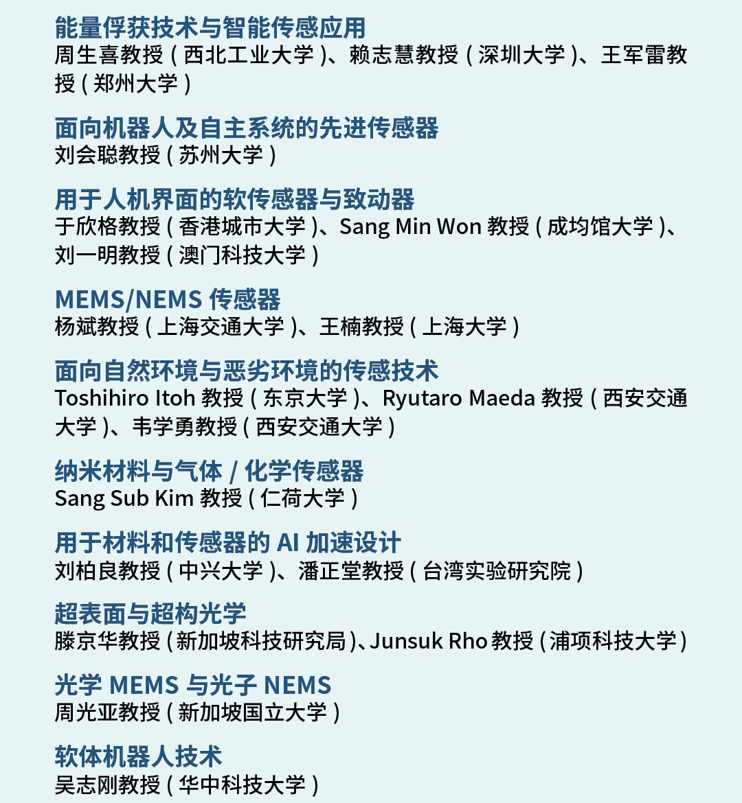 大会设立多个专题分会场,聚焦传感器、传感技术、人工智能传感器及其增强系统,并探究其在可穿戴柔性电子、生物医学成像、芯片实验室 (LOC) 和微全分析系统、物联网、遥感技术、纳米材料、超构光学、MEMS/NEMS、自供电系统、软体电子、气体传感、环境感知、智慧医疗与生物电子学、能量俘获以及机器人等前沿领域的深度融合与创新应用。继2024年新加坡与2025年马来西亚会议取得圆满成功后,我们诚邀全球顶尖学者汇聚济州岛,共襄盛举,携手推动传感技术的未来发展。