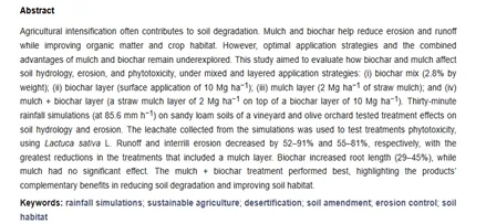 [1] Canedo, J. N. G. V., Coelho, L., Castro, L., Verheijen, F. G. A., & Prats, S. (2025). Biochar and Mulch: Hydrologic, Erosive, and Phytotoxic Responses Across Different Application Strategies and Agricultural Soils. Agronomy, 15(4), 926. https://doi.org/10.3390/agronomy15040926
