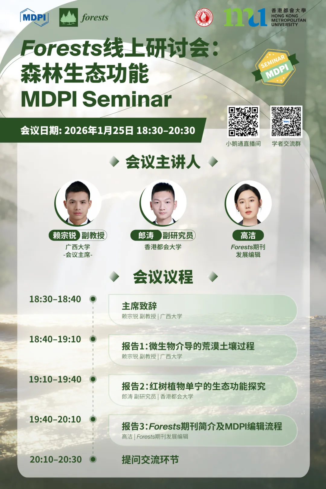 本次研讨会,Forests 期刊特别邀请到广西大学的赖宗锐副教授担任会议主席,携手香港都会大学的郎涛副研究员和 Forests 期刊发展编辑高洁女士,分别带来“微生物介导的荒漠土壤过程”“红树植物单宁的生态功能探究”“Forests 期刊简介及MDPI编辑流程”三场精彩报告。诚邀各位学者齐聚一堂、共探前沿!
