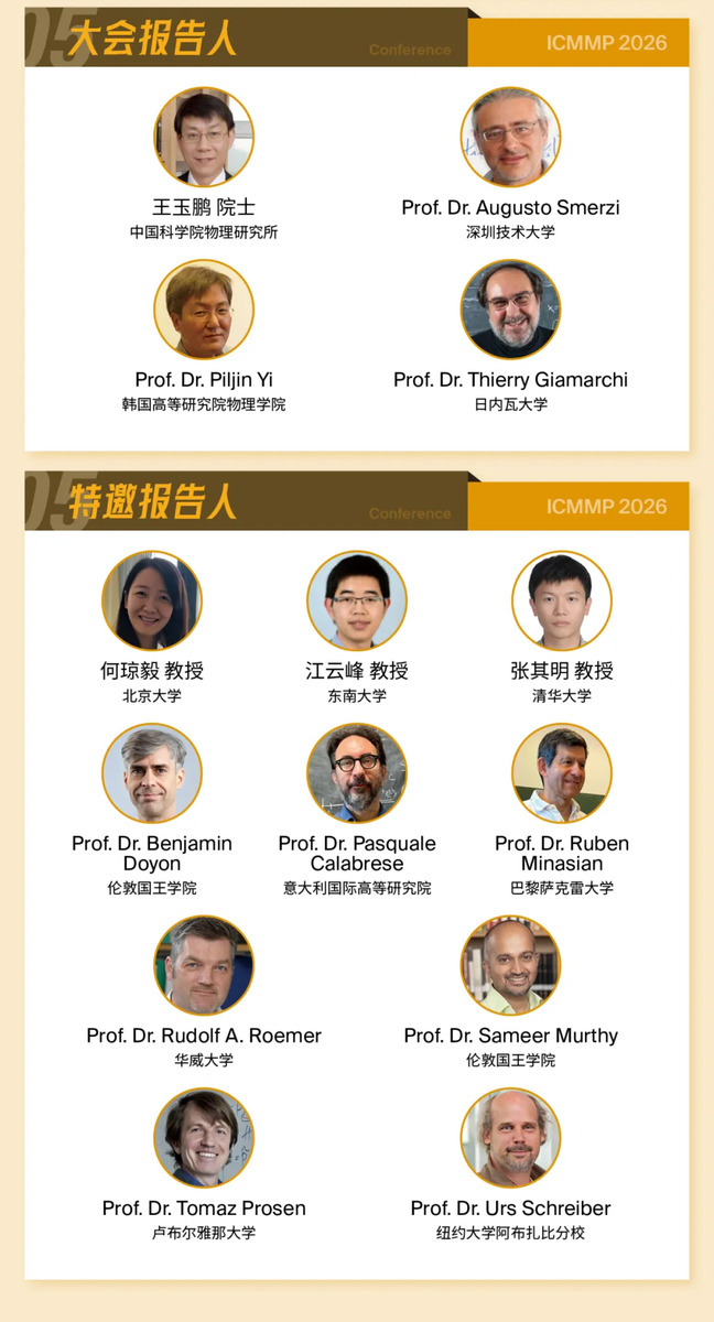 ICMMP 2026 聚焦现代数学物理的核心前沿,汇聚了来自全球著名高校与研究机构的杰出学者。与会专家涵盖量子场论、弦论、量子引力、可积模型、凝聚态与统计物理、量子信息与AMO物理等重要方向,其中包括国际科学院院士、ERC资助获得者、Frontiers of Science Award获奖者,以及长期引领学科发展的理论物理领军人物。