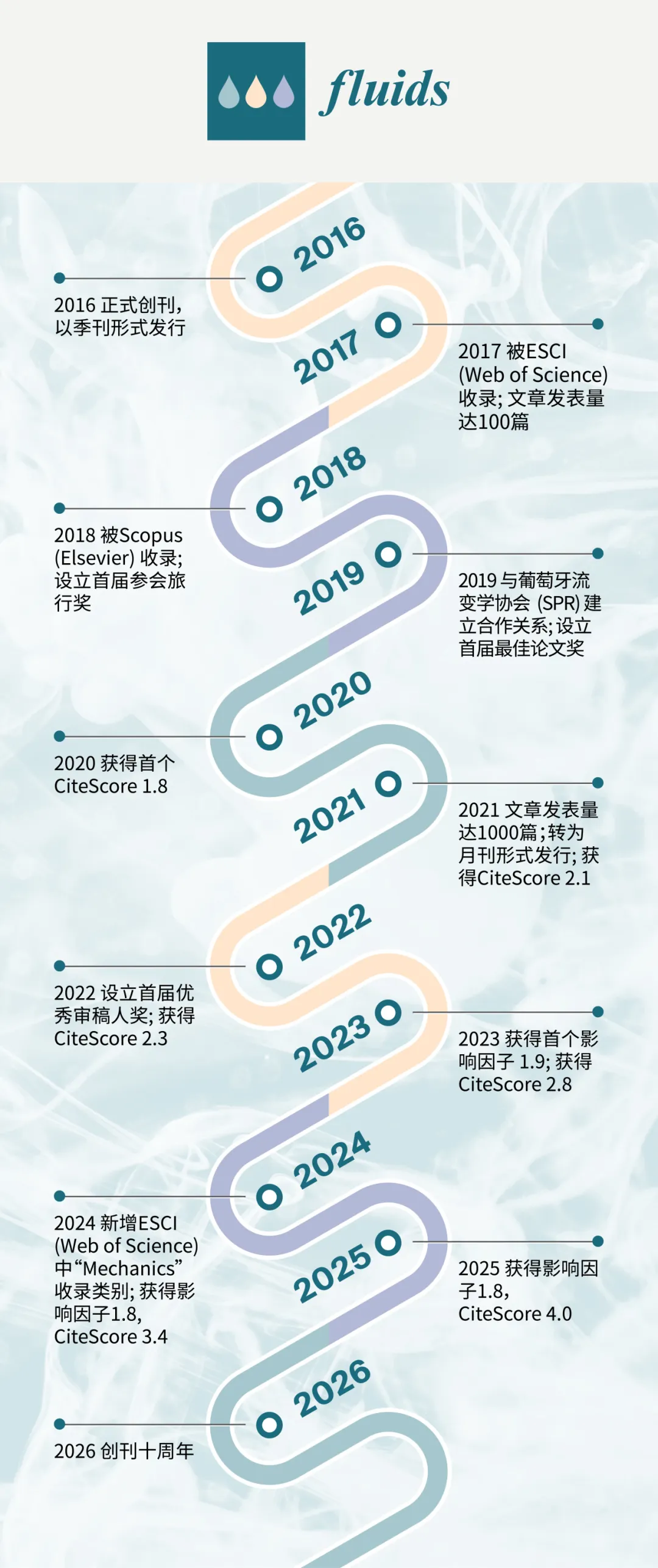 2026年是 Fluids (ISSN 2311-5521) 期刊发展的重要里程碑。Fluids 已发表论文2400余篇,作者超过6800位,超过4100位审稿人至少审阅过本刊一次。回首十年, Fluids 取得的每一分成绩,都凝聚着作者、审稿人、编委与客座编辑的耕耘,也伴随着每一位读者的成长与陪伴。期刊团队在此深表谢意,并期盼未来能与各位继续并肩前行。现在,让我们一同回顾这段充满机遇与挑战的十年历程。