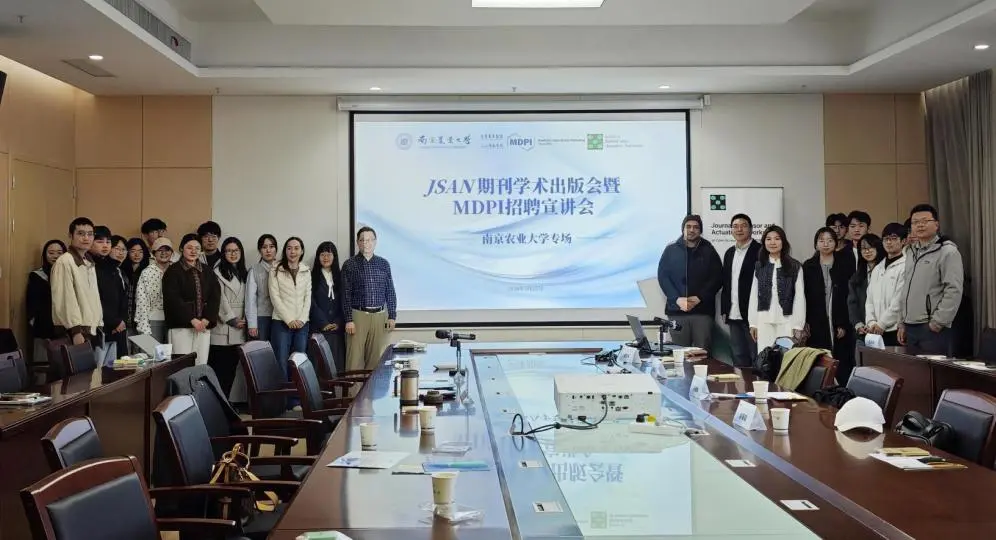 2026年3月25日下午,Journal of Sensor and Actuator Networks (JSAN)期刊编辑团队及MDPI南京办公室经理一行来到南京农业大学智慧农业学院 (人工智能学院),拜访学院副院长、JSAN期刊主编舒磊教授,并与学院联合举办了学术出版交流会暨招聘宣讲会。多名师生齐聚现场,与编辑团队进行面对面交流,解锁国际学术出版秘籍与学术职业发展新路径,现场气氛非常热烈!