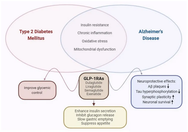 (1) 阿尔茨海默病 (AD) 和2型糖尿病 (T2DM) 具有若干共同的病理特征,包括胰岛素抵抗、慢性炎症、氧化应激、线粒体功能障碍以及β-淀粉样蛋白 (Aβ)/tau蛋白病理。这些重叠的机制表明,针对代谢功能障碍的疗法 (如GLP-1受体激动剂) 可能亦有助于AD的治疗。