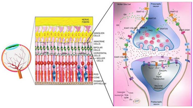 (1) 本研究强调了穆勒胶质细胞 (MCs) 通过严格调控细胞外谷氨酸水平在维持视网膜稳态中的关键作用。MCs表达钠离子依赖性谷氨酸转运蛋白 (EAATs),这些转运蛋白通过清除过量的谷氨酸 (视网膜中一种重要的兴奋性神经递质) 来预防兴奋性中毒,从而保护视网膜神经元免受谷氨酸过度积累所致的损伤。